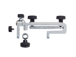 The jig comprises an upper base with a lower clamp and two locking knobs for fixing the tool. The jig slides on the Universal Support on nylon bushings across the grindstone. The edge angle is set with the Micro Adjust (3) on the Universal Support (4).